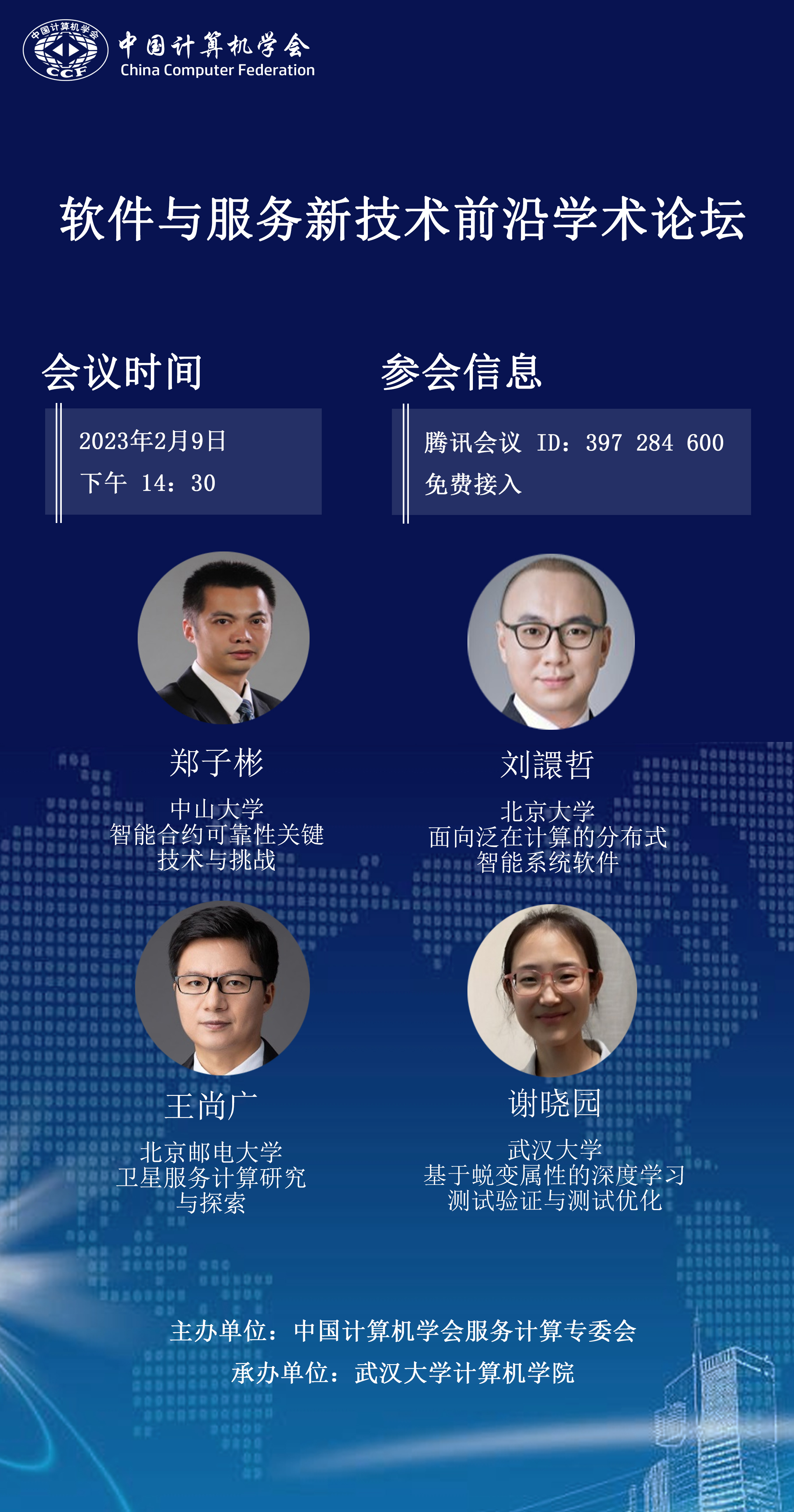 拟于2023年2月9日举办“软件与服务新技术前沿学术论坛”(线上),邀请服务计算与软件工程领域四位知名学者做主题报告,研讨新形势下服务计算与软件工程中面临的热点问题和未来方向。