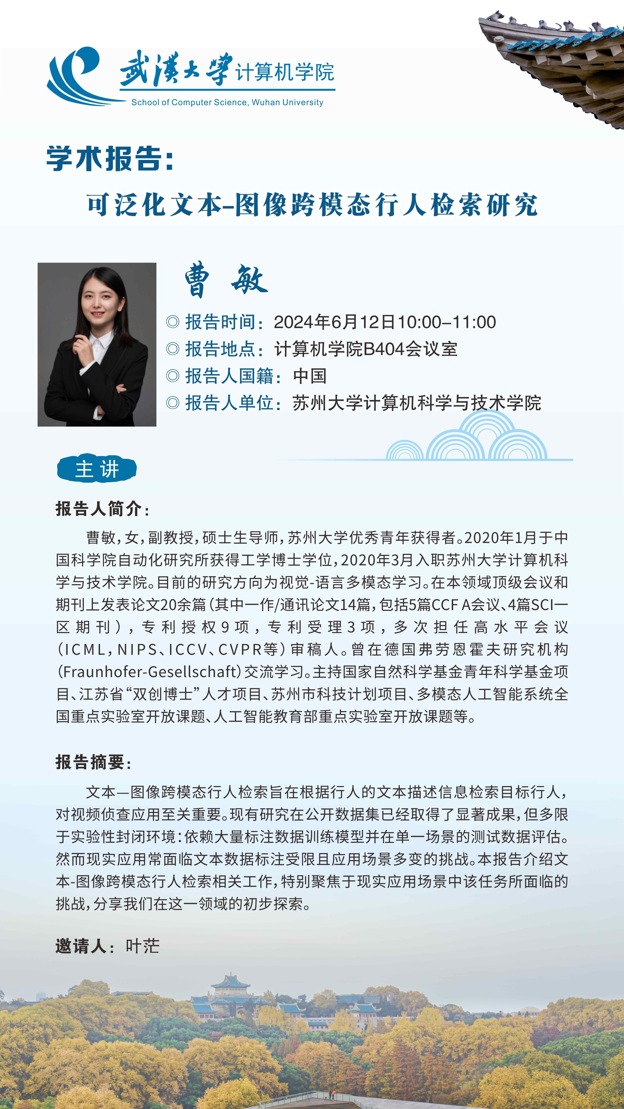 报告人简介:曹敏,女,副教授,硕士生导师,苏州大学优秀青年获得者。2020年1月于中国科学院自动化研究所获得工学博士学位,2020年3月入职苏州大学计算机科学与技术学院。目前的研究方向为视觉-语言多模态学习。在本领域顶级会议和期刊上发表论文20余篇(其中一作/通讯论文14篇,包括5篇CCF A会议、4篇SCI一区期刊),专利授权9项,专利受理3项,多次担任高水平会议(ICML,NIPS、ICCV、CVPR等)审稿人。曾在德国弗劳恩霍夫研究机构(Fraunhofer-Gesellschaft)交流学习。主持国家自然科学基金青年科学基金项目、江苏省“双创博士”人才项目、苏州市科技计划项目、多模态人工智能系统全国重点实验室开放课题、人工智能教育部重点实验室开放课题等。