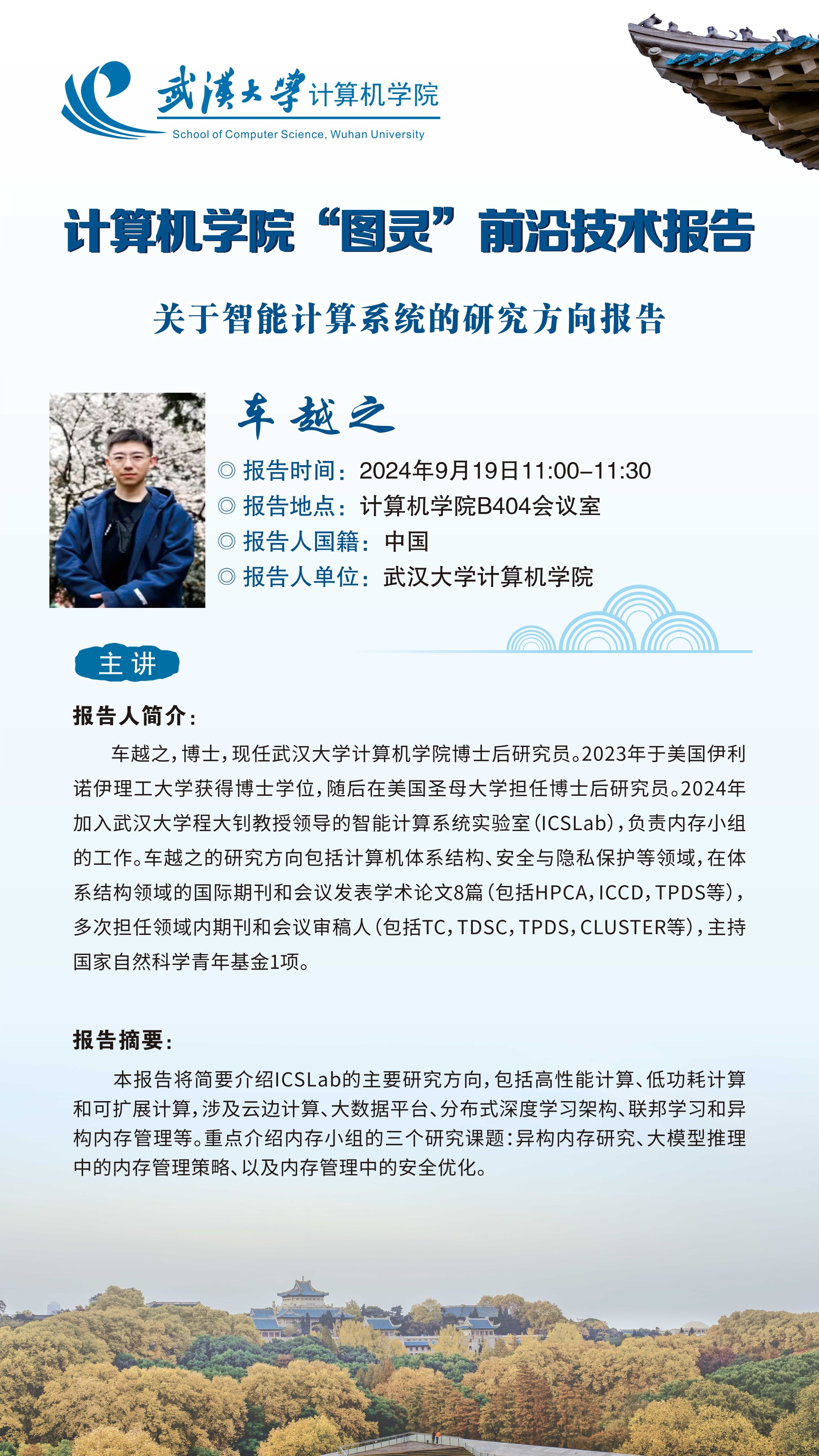 报告摘要:本报告将简要介绍ICSLab的主要研究方向,包括高性能计算、低功耗计算和可扩展计算,涉及云边计算、大数据平台、分布式深度学习架构、联邦学习和异构内存管理等。重点介绍内存小组的三个研究课题:异构内存研究、大模型推理中的内存管理策略、以及内存管理中的安全优化。