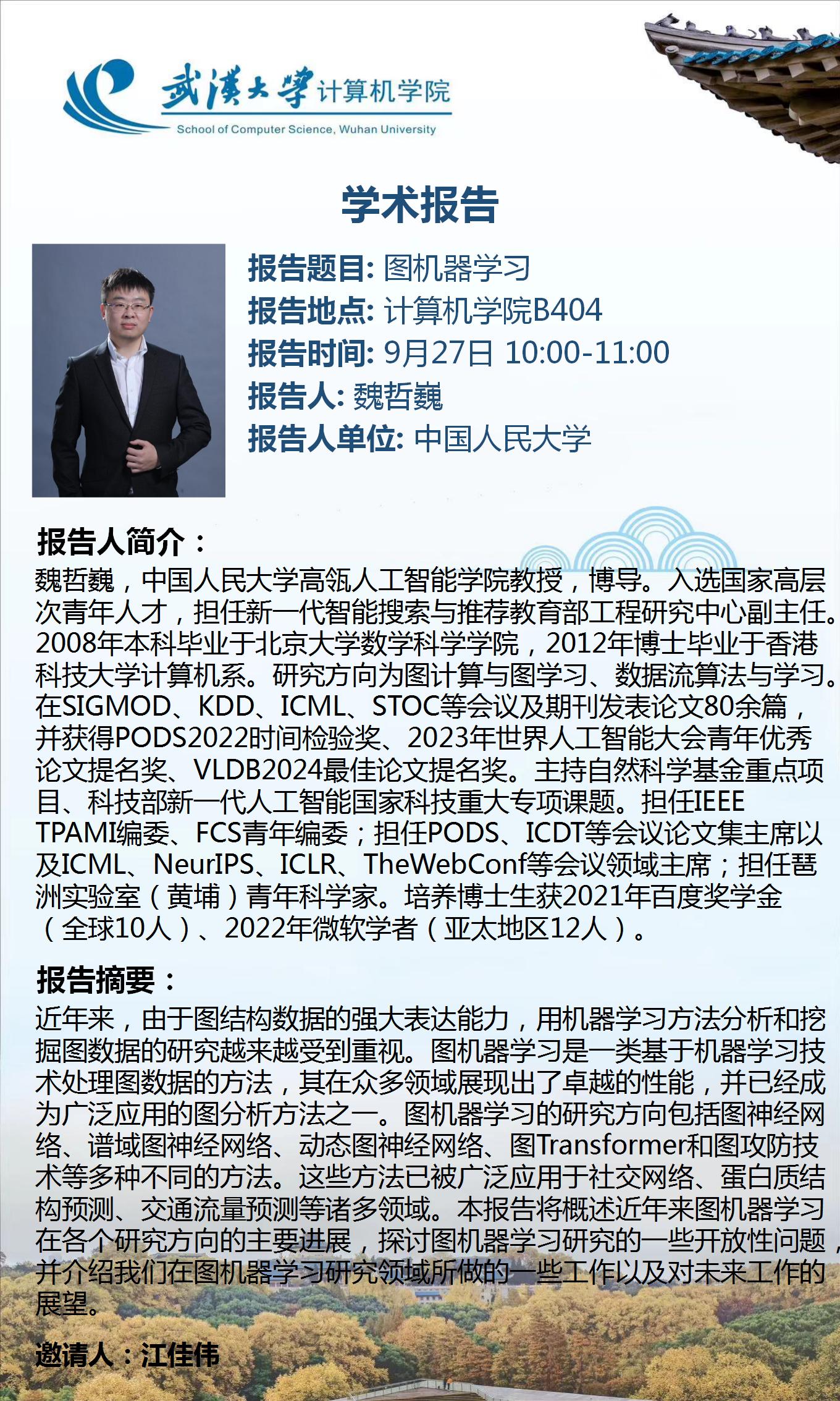 报告人简介:魏哲巍,中国人民大学高瓴人工智能学院教授,博导。入选国家高层次青年人才,担任新一代智能搜索与推荐教育部工程研究中心副主任。2008年本科毕业于北京大学数学科学学院,2012年博士毕业于香港科技大学计算机系。研究方向为图计算与图学习、数据流算法与学习。在SIGMOD、KDD、ICML、STOC等会议及期刊发表论文80余篇,并获得PODS2022时间检验奖、2023年世界人工智能大会青年优秀论文提名奖、VLDB2024最佳论文提名奖。主持自然科学基金重点项目、科技部新一代人工智能国家科技重大专项课题。担任IEEE TPAMI编委、FCS青年编委;担任PODS、ICDT等会议论文集主席以及ICML、NeurIPS、ICLR、TheWebConf等会议领域主席;担任琶洲实验室(黄埔)青年科学家。培养博士生获2021年百度奖学金(全球10人)、2022年微软学者(亚太地区12人)。
