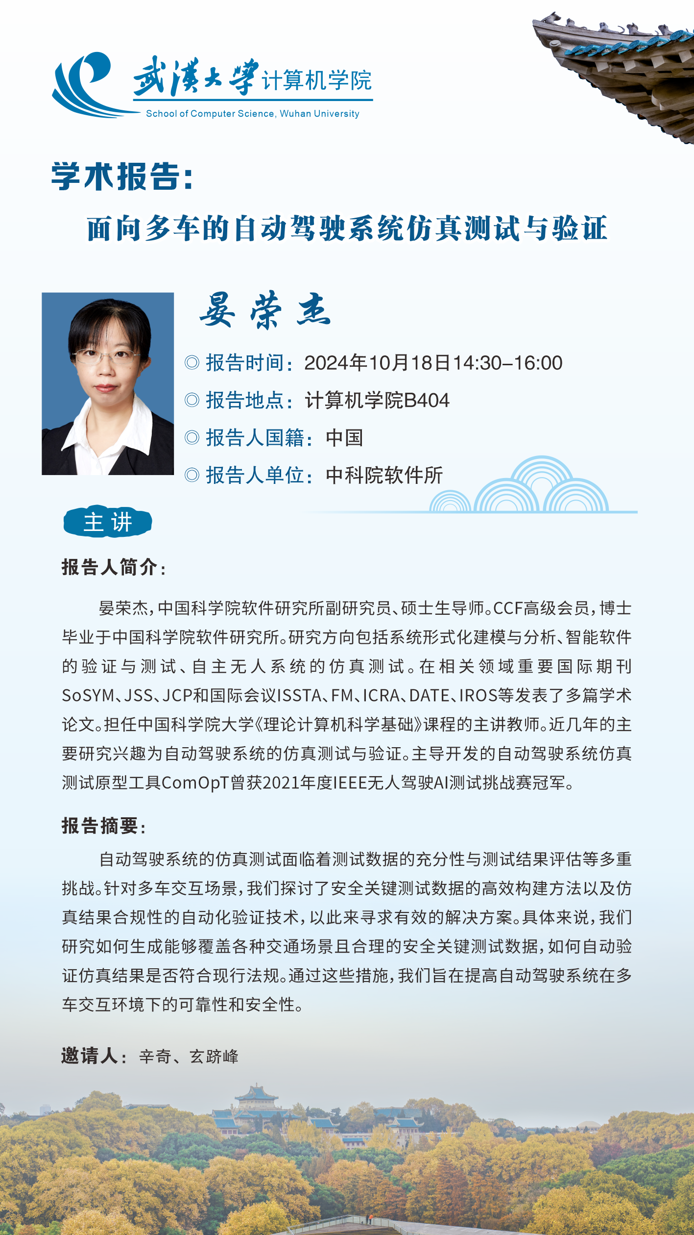 报告人简介:晏荣杰,中国科学院软件研究所副研究员、硕士生导师。CCF高级会员,博士毕业于中国科学院软件研究所。研究方向包括系统形式化建模与分析、智能软件的验证与测试、自主无人系统的仿真测试。在相关领域重要国际期刊SoSYM、JSS、JCP和国际会议ISSTA、FM、ICRA、DATE、IROS等发表了多篇学术论文。担任中国科学院大学《理论计算机科学基础》课程的主讲教师。近几年的主要研究兴趣为自动驾驶系统的仿真测试与验证。主导开发的自动驾驶系统仿真测试原型工具ComOpT曾获2021年度IEEE无人驾驶AI测试挑战赛冠军。