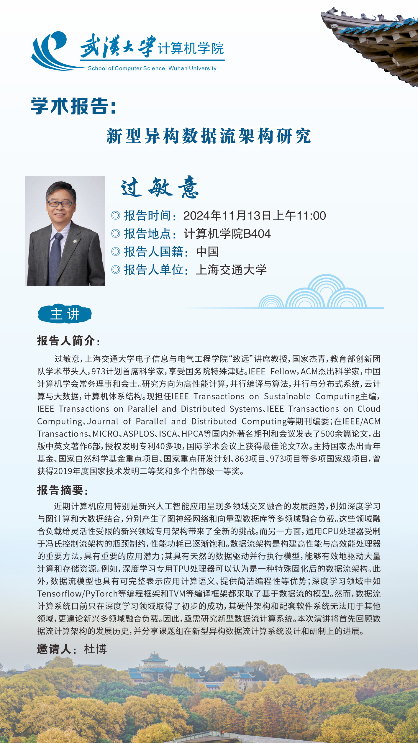 报告人简介:过敏意,上海交通大学电子信息与电气工程学院“致远”讲席教授,国家杰青,教育部创新团队学术带头人,973计划首席科学家,享受国务院特殊津贴。IEEE Fellow,ACM 杰出科学家,中国计算机学会常务理事和会士 。研究方向为高性能计算,并行编译与算法,并行与分布式系统,云计算与大数据,计算机体系结构。现担任IEEE Transactions on Sustainable Computing主编,IEEE Transactions on Parallel and Distributed Systems、IEEE Transactions on Cloud Computing、Journal of Parallel and Distributed Computing等期刊编委;在IEEE/ACM Transactions、MICRO、ASPLOS、ISCA、HPCA等国内外著名期刊和会议发表了500余篇论文,出版中英文著作6部,授权发明专利40多项,国际学术会议上获得最佳论文7次。主持国家杰出青年基金、国家自然科学基金重点项目、国家重点研发计划、863项目、973项目等多项国家级项目,曾获得2019年度国家技术发明二等奖和多个省部级一等奖。