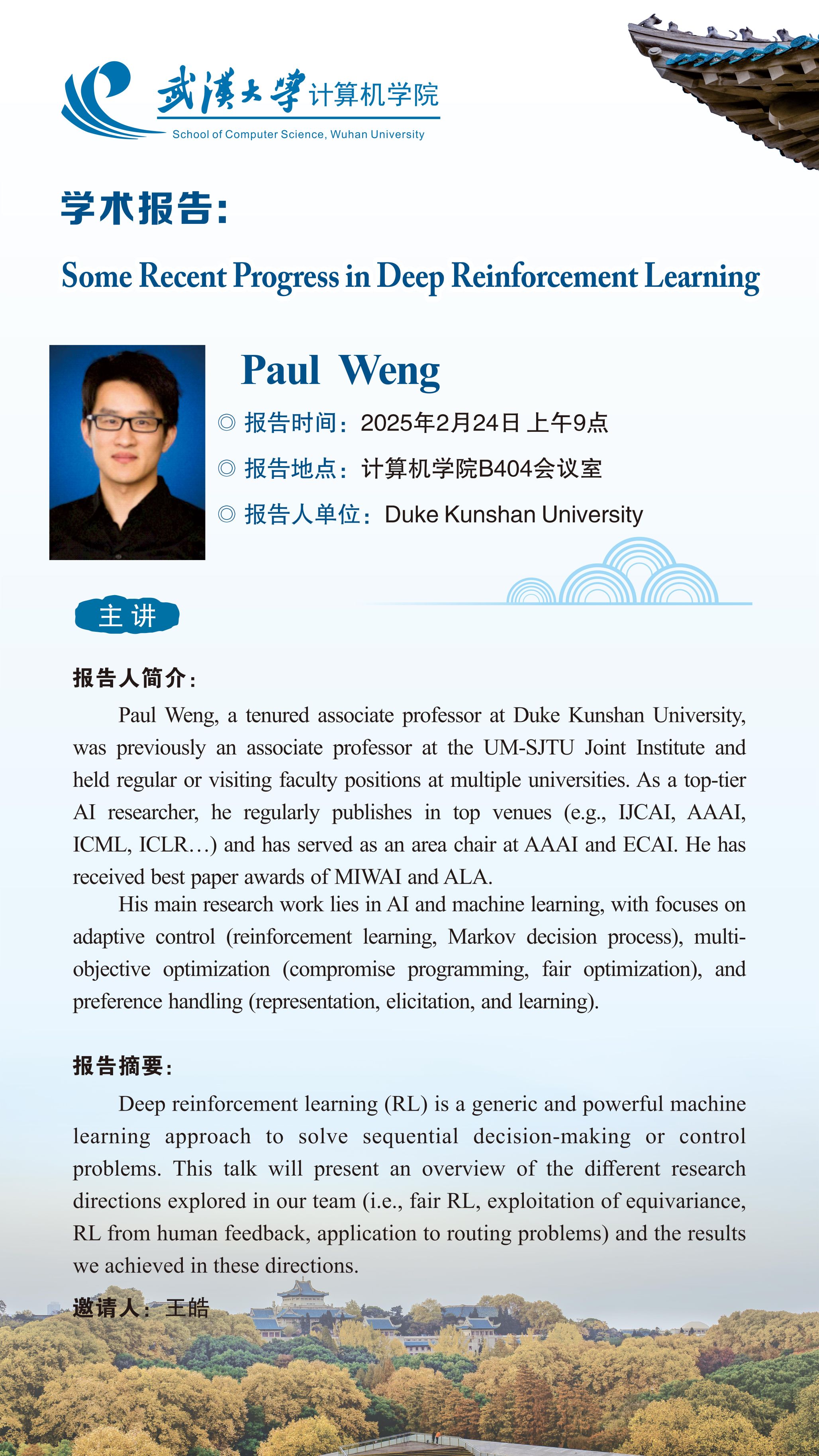 报告题目: Some Recent Progress in Deep Reinforcement Learning