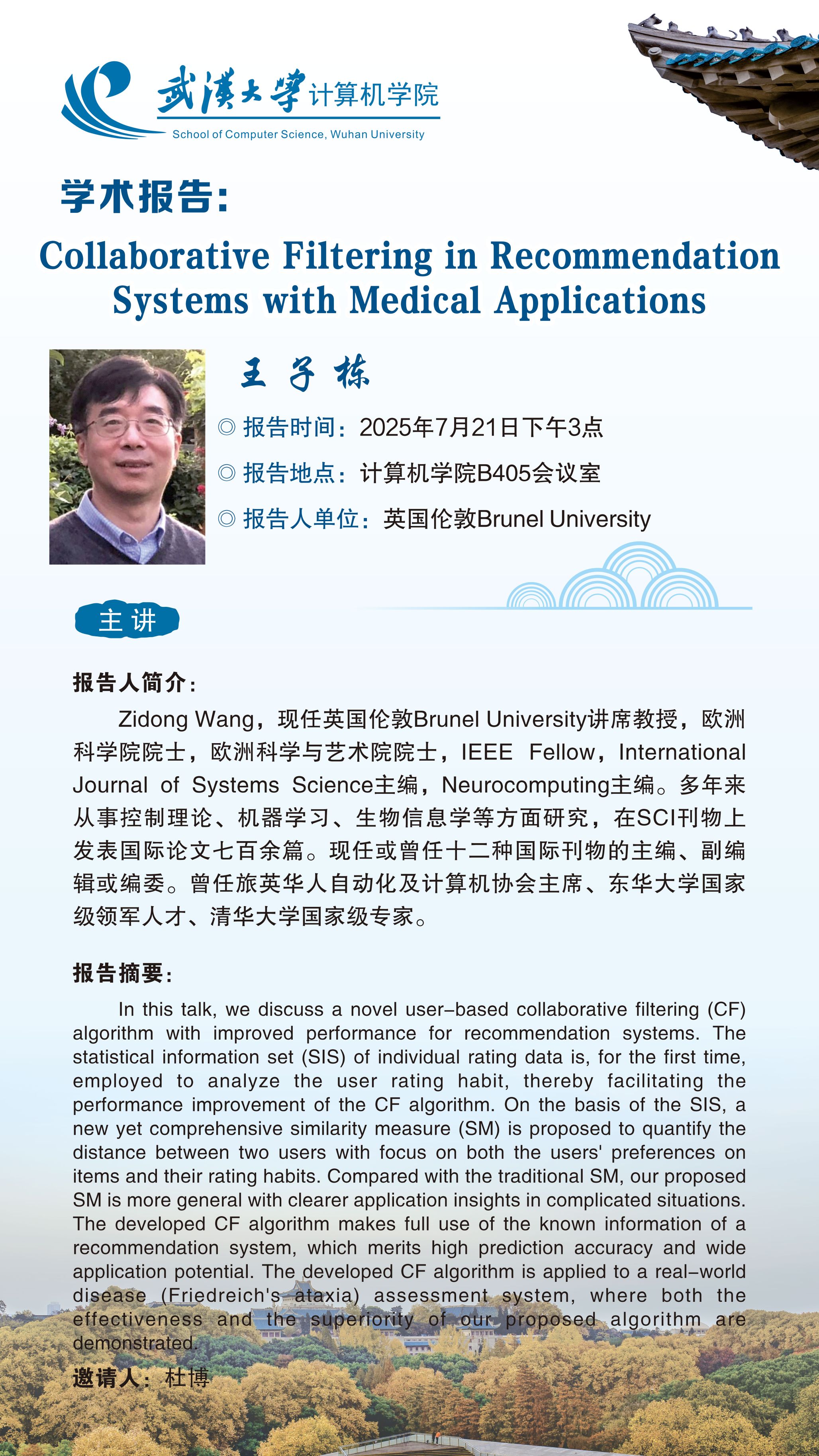 报告摘要:In this talk, we discuss a novel user-based collaborative filtering (CF) algorithm with improved performance for recommendation systems. The statistical information set (SIS) of individual rating data is, for the first time, employed to analyze the user rating habit, thereby facilitating the performance improvement of the CF algorithm. On the basis of the SIS, a new yet comprehensive similarity measure (SM) is proposed to quantify the distance between two users with focus on both the users' preferences on items and their rating habits. Compared with the traditional SM, our proposed SM is more general with clearer application insights in complicated situations. The developed CF algorithm makes full use of the known information of a recommendation system, which merits high prediction accuracy and wide application potential. The developed CF algorithm is applied to a real-world disease (Friedreich's ataxia) assessment system, where both the effectiveness and the superiority of our proposed algorithm are demonstrated.