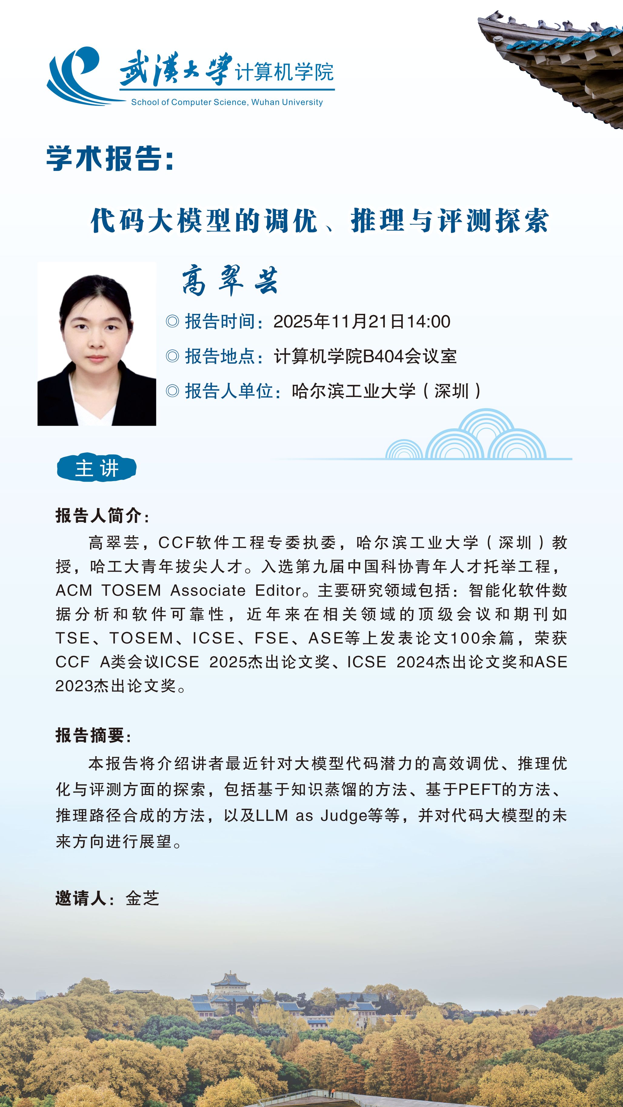 报告人简介:高翠芸,CCF软件工程专委执委,哈尔滨工业大学(深圳)教授,哈工大青年拔尖人才。入选第九届中国科协青年人才托举工程,ACM TOSEM Associate Editor。主要研究领域包括:智能化软件数据分析和软件可靠性,近年来在相关领域的顶级会议和期刊如TSE、TOSEM、ICSE、FSE、ASE等上发表论文100余篇,荣获CCF A类会议ICSE 2025杰出论文奖、ICSE 2024杰出论文奖和ASE 2023杰出论文奖。