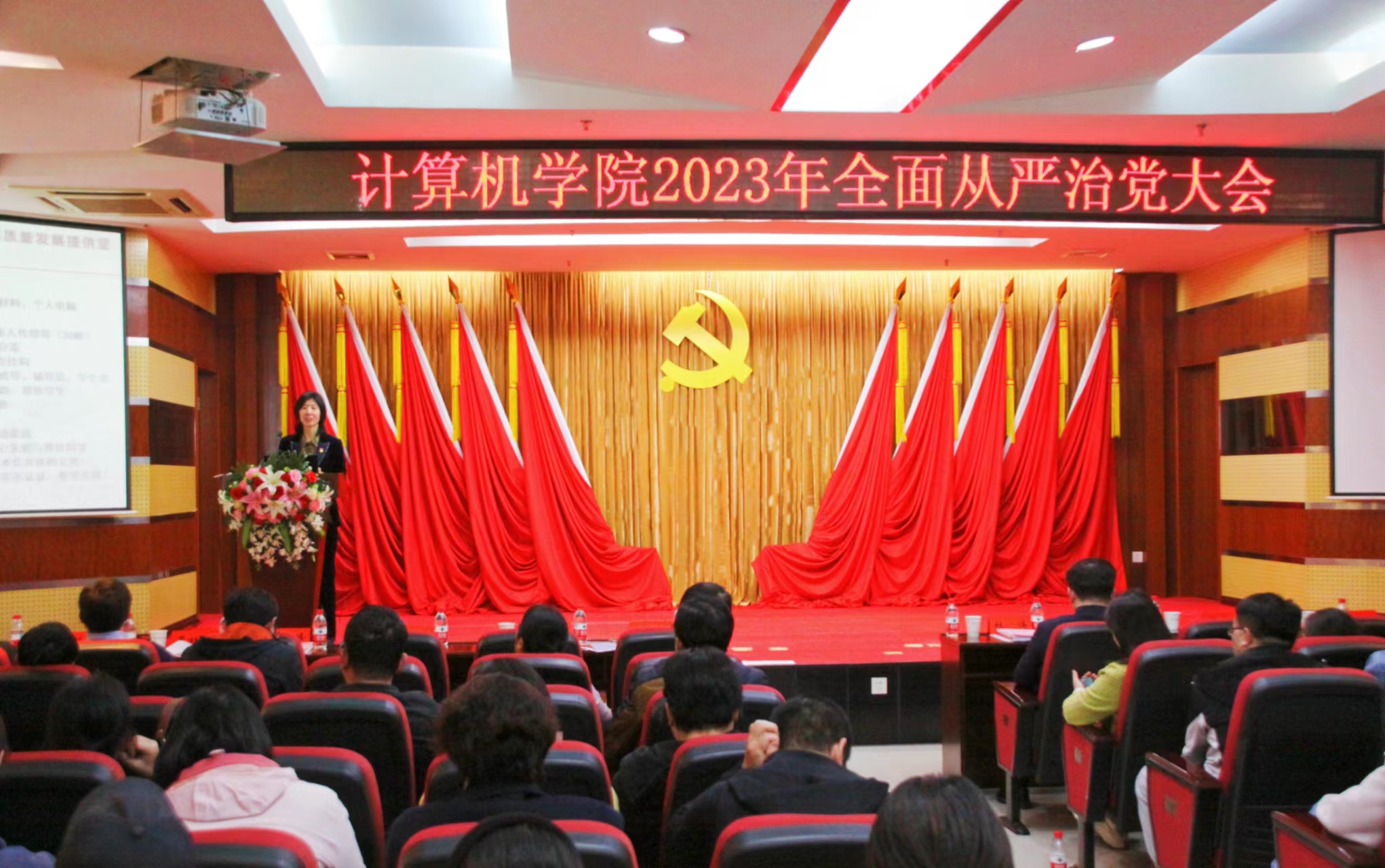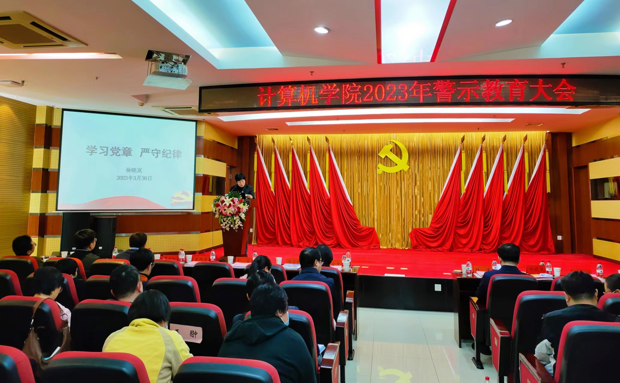 在学院八楼报告厅召开了2023年全面从严治党暨警示教育大会。会议由院党委副书记高卫松主持,院党委委员、纪委委员、院领导班子成员、系(中心)及内设机构干部、师生党支部委员及全体教职工参加了会议。