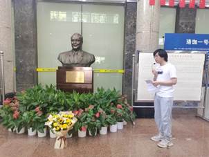 随后,全体党员同志移步至信息学部图书馆金通尹先生铜像前,遥感二支部组织委员左肖龙同志介绍了金通尹先生的生平事迹。战火纷飞的年代,金通尹先生积极组织救国,辞去一切职务,闭门谢客,蓄须明志,读书赋诗以寄忧国忧民之情,保持民族气节。新中国成立初期,虽年逾花甲,生活有诸多不便,但为了新中国的教育事业,金通尹先生毅然离开居住数十年的上海,只身赴任青岛工学院院长。1956年武汉测量制图学院诞生,金通尹先生从青岛来到武汉,为学校建设昼夜操劳不遗余力,将他自己40余年从事教育事业的宝贵经验带给了武汉测绘学院,为奠定新中国民用测绘高等教育的基础和发展新中国高等教育事业作出了重大贡献。