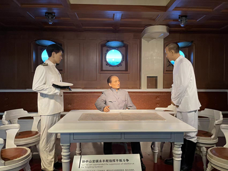 在二楼以及三楼展厅,支部党员通过馆内珍藏的中山舰打捞文物和历史卡片,深入了解了中山舰的百年历史。在孙中山先生坐镇永丰舰指挥平叛的雕像前,大家感受到了大战将至的紧张气氛,被革命先辈为民族解放和国家独立奋斗不息的精神所折服。在中山舰文物纪念厅,威严的舰载火炮和锈迹斑斑的勋章无声地彰显着军人的骄傲,朴素的瓷碗和自制的乒乓球拍,又让我们感受到了那个时代的简朴和真实。