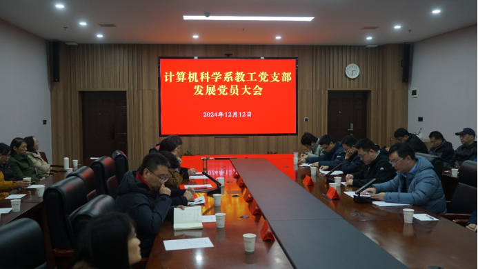 2024年12月12日下午,计算机科学系教工党支部召开党员发展大会,讨论接收王皓同志为中共预备党员,会议由支部书记黄浩同志主持,校党委组织部副部长刘义胜、学院党委书记边金鸾、党委副书记高卫松、纪委书记杨晓岚、计算机科学系教工党支部全体党员参加大会。