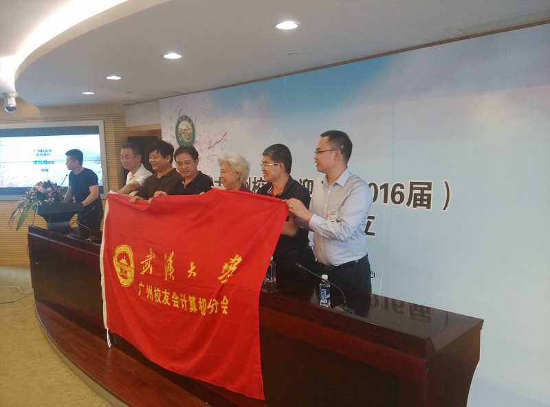 院长汤庸教授当选首任分会会长。 广州校友会名誉会长梁宜希向计算机分会授旗。胡瑞敏院长在发言中,首先对大会表示热烈祝贺!祝贺广州校友会计算机分会成为我校第一个计算机分会。对长期以来情系母校计算机学科,关心支持母校计算机专业建设与发展的广大校友们表示衷心的感谢!胡院长还介绍了其他一线城市计算机分会筹备情况。