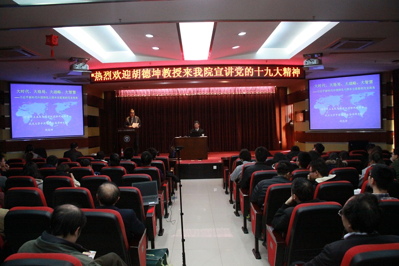 党委邀请,我校人文社科资深教授、学校十九大精神宣讲团成员、著名历史学家、海洋问题咨询专家、国家领土主权与海洋权益协同创新中心主任、首席专家胡德坤来院宣讲党的十九大精神。学院党委书记沃闻达主持报告会,在院全体院领导、全院教职工,本科生、研究生党员代表及部分青年团员400余人聆听了宣讲报告。