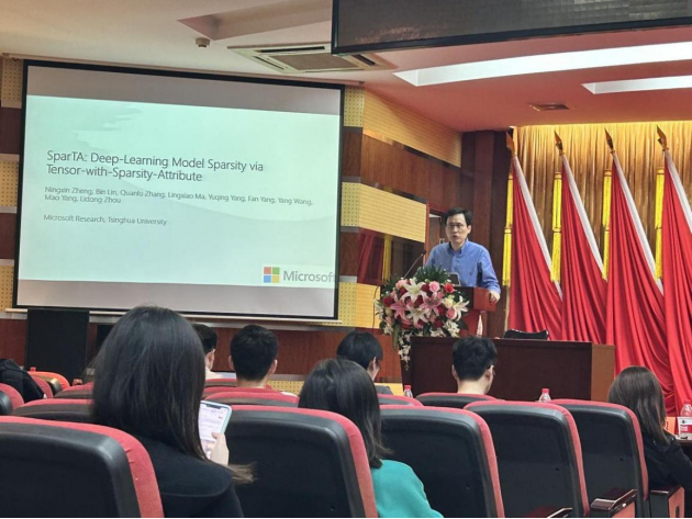 副研究员胡创主持。微软亚洲研究院高级研究员杨凡作题为“通过具有稀疏属性的张量实现端到端的深度学习模型稀疏化”的报告,第一会所