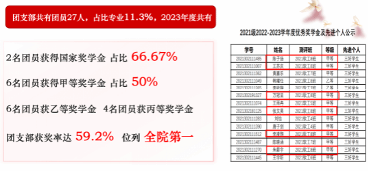 一年来,支部2名团员获得国家奖学金,6名团员获得甲等奖学金,团支部获奖率占全年级59.2%,位列全院第一。学科竞赛方面,团支部成员共获得学科竞赛国家级奖项11项,省部级奖项8项,获奖人数位列全院第一。在支部成员的成长实践中,他们坚信:学思贯通,知行合一,方能发展前行;脚踏实地,仰望星空,方能与时俱进。