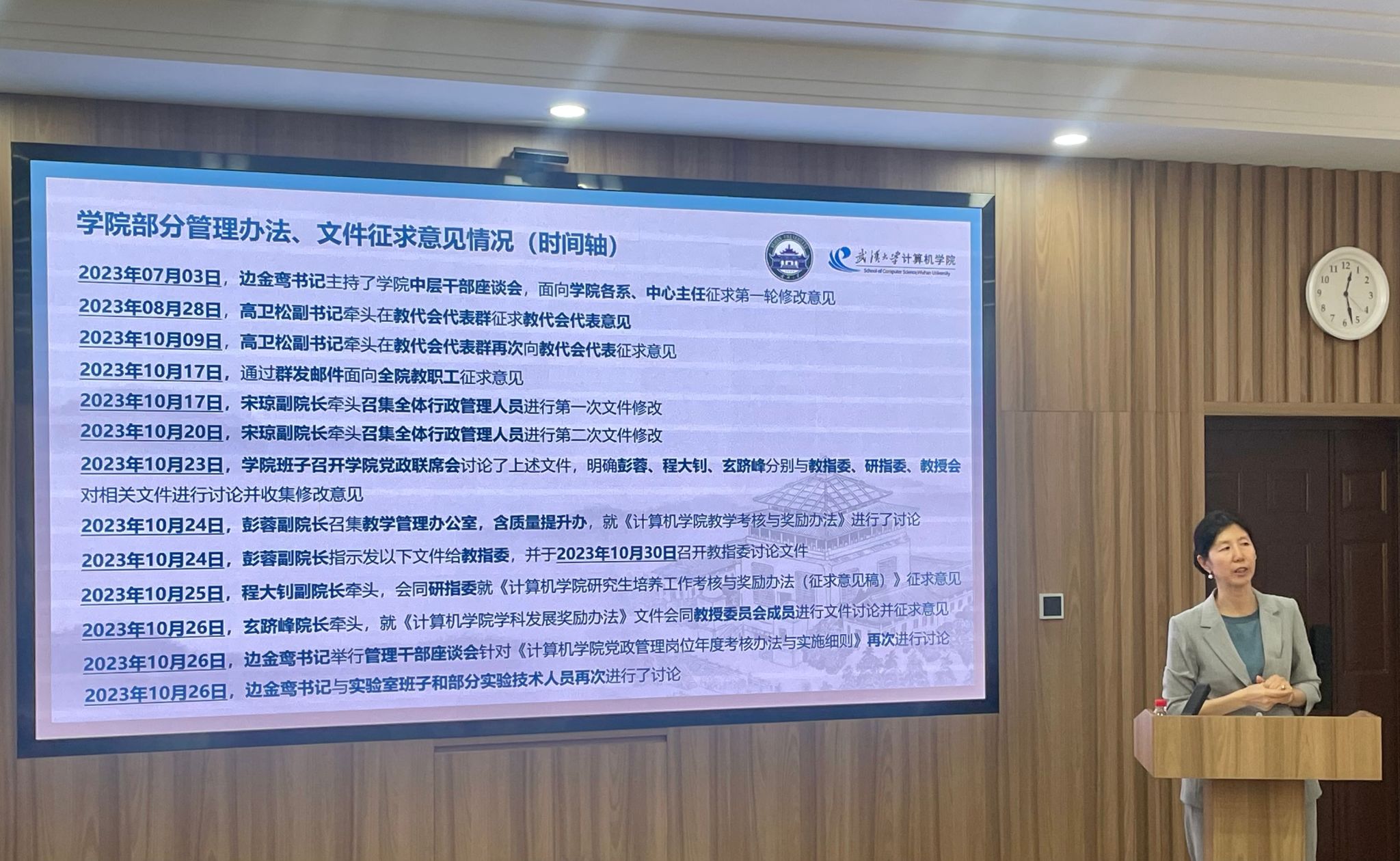 图2:边金鸾书记在第四届教代会专题会议上介绍学院部分管理办法、文件