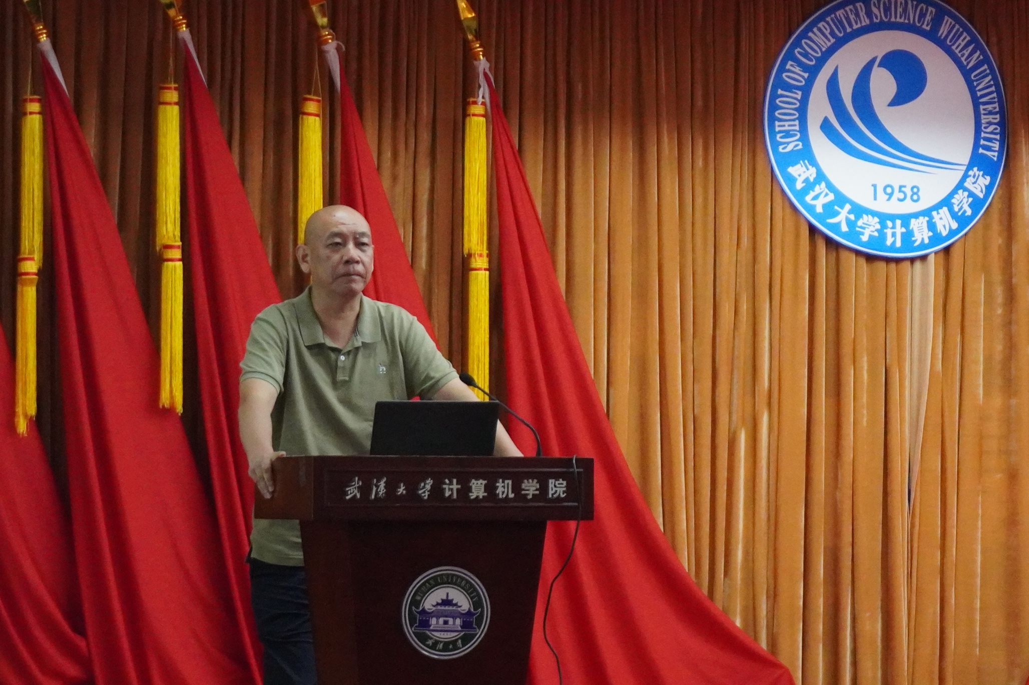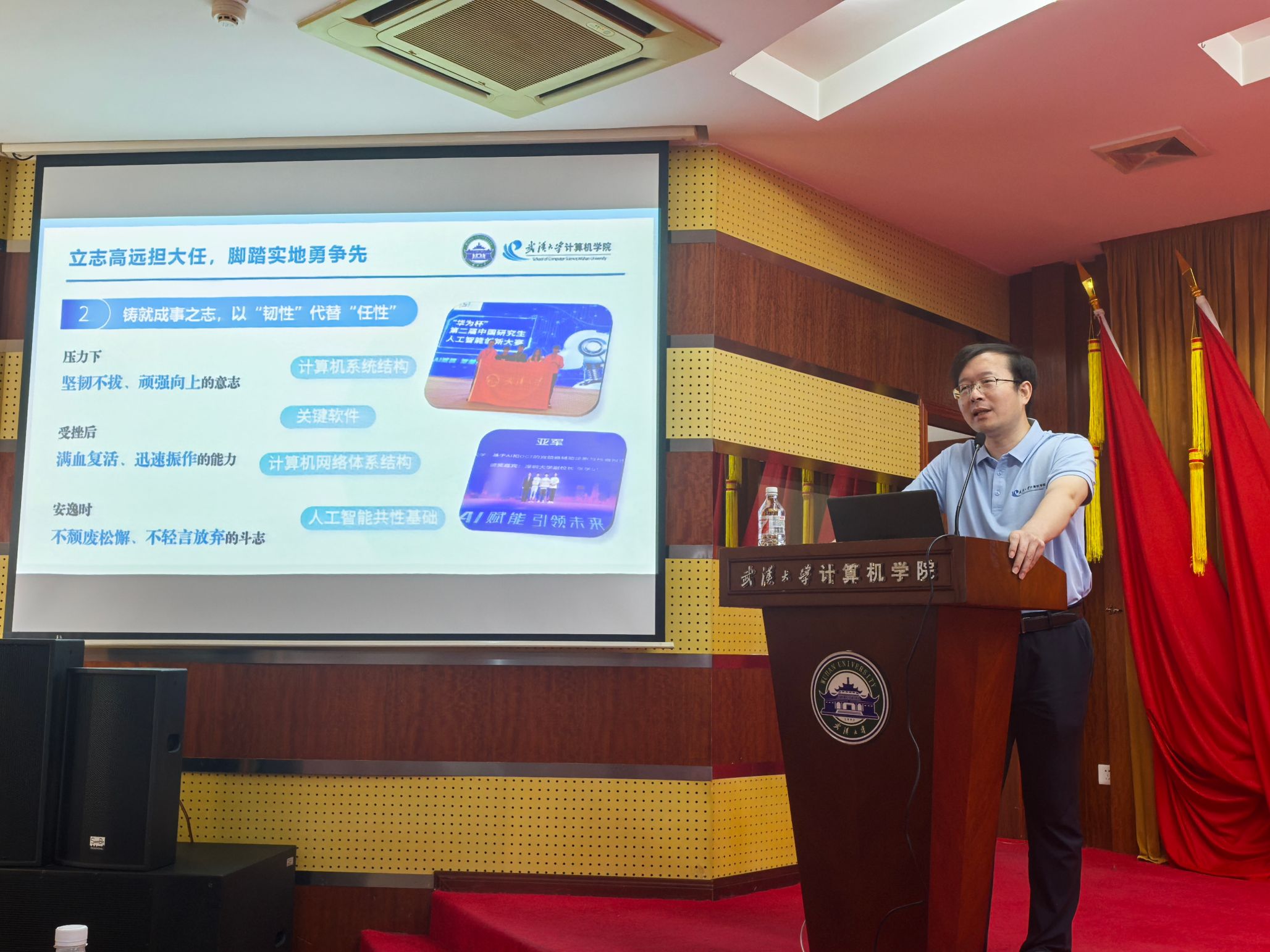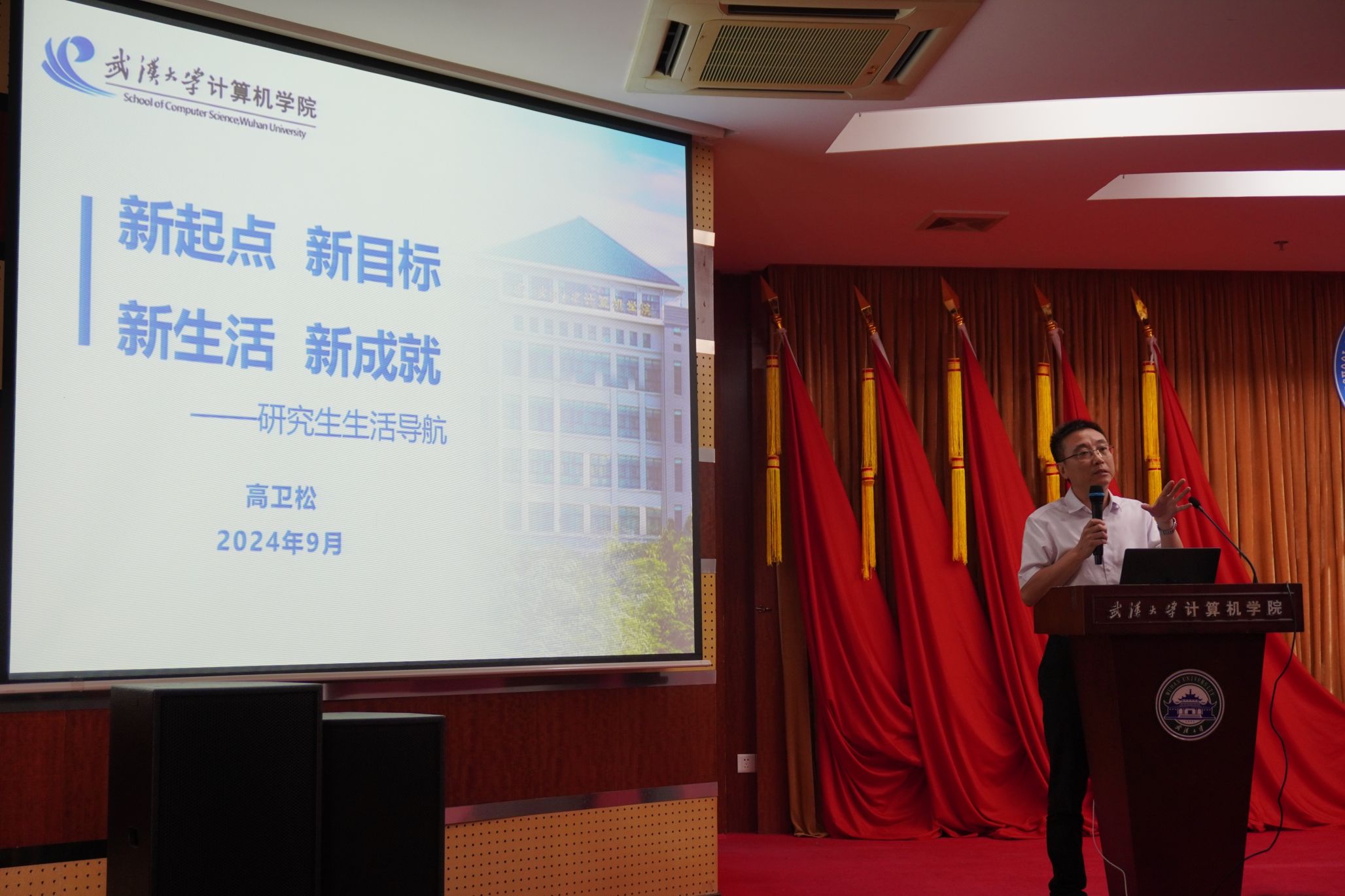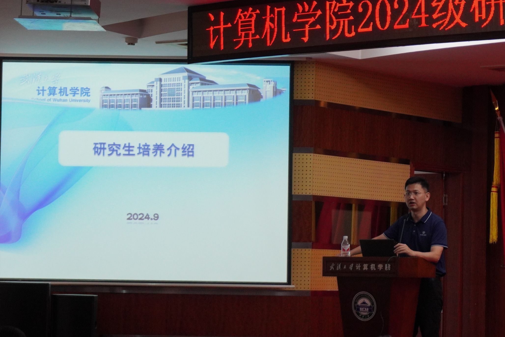 院长杜博。杜院长以“云程发轫正当时,奋楫扬帆再启航,立志高远担大任,脚踏实地勇争先”为主题,围绕学院基本情况与学院优秀院友,为研究生新生介绍了学院发展的历史沿革、学院建制、专业设置、师资队伍、平台建设、学科建设、人才队伍建设、科研成果、毕业生就业情况及杰出院友等,并对即将开展的研究生生活提出了要求与希望,同时祝愿同学们在珞珈山下求得真学问、学得真本领,以挺膺之姿赴青春之约。