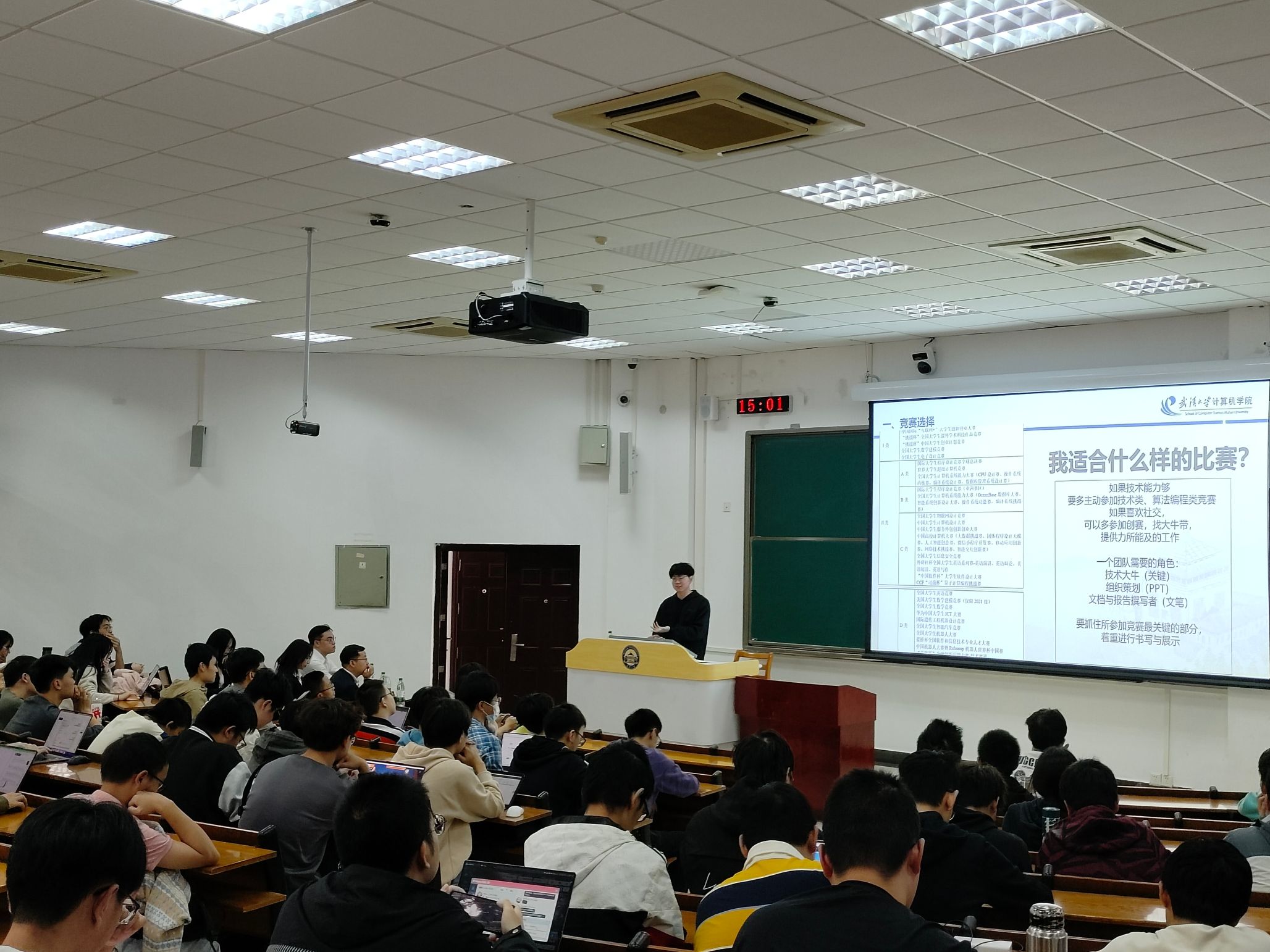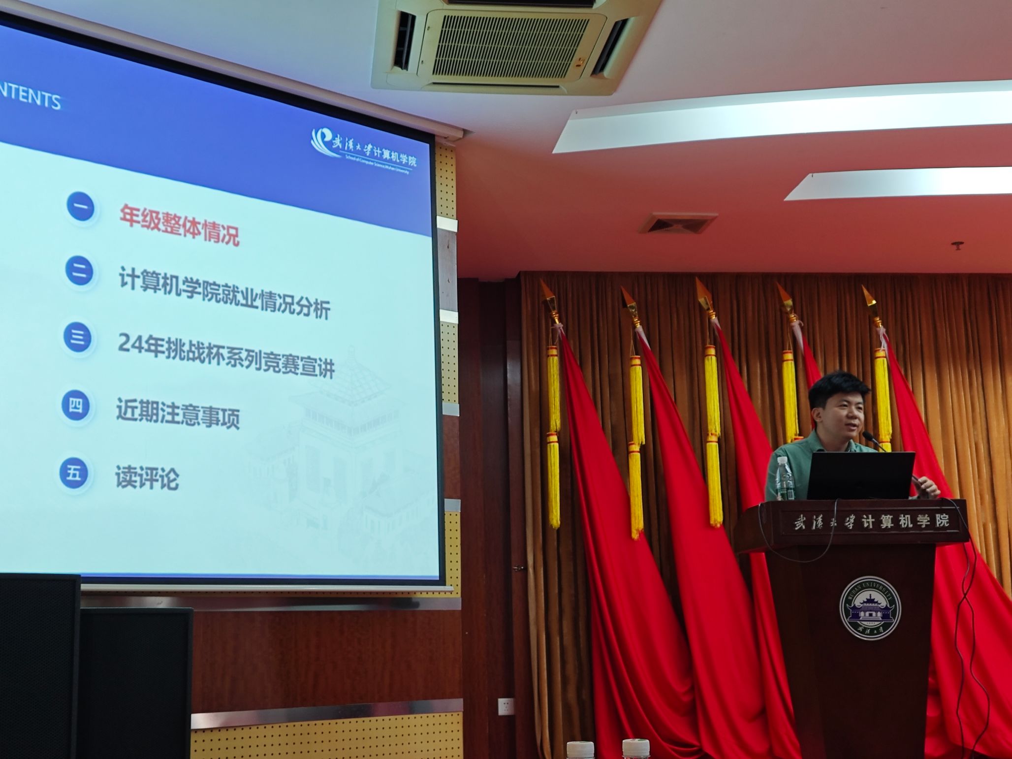 此外,各年级也结合不同阶段学生的需求为同学们准备了干货满满的分享。2022级邀请到腾讯和泰康科技公司带来就业信息分享,HR分析了目前的就业形势,并且带领同学们深入探索优秀简历的精髓。会上兼职辅导员张越同学也分享了竞赛经验。2023级邀请到校团委大创中心挑战杯项目组负责人李雨轩同学为大家介绍“挑战杯”系列竞赛,她从赛事政策、赛事规则、备赛要点、信息获取四个方面进行了深入讲解,为大家清晰地指明了参加挑战杯的途径和思路。