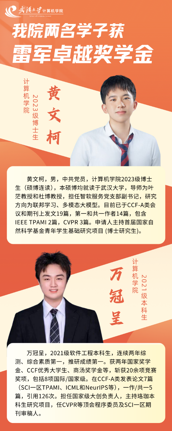 我院长期重视拔尖创新人才培养,依托学院师资力量和科研平台,鼓励学生积极参与科研项目和实验室工作,加快构建高质量育人体系。学院学子连续两年斩获雷军卓越奖学金。期待更多优秀计科学子在学术研究、科技创新、社会实践等方面不断努力,勇攀高峰,实现更加卓越的学术成就和个人发展!
