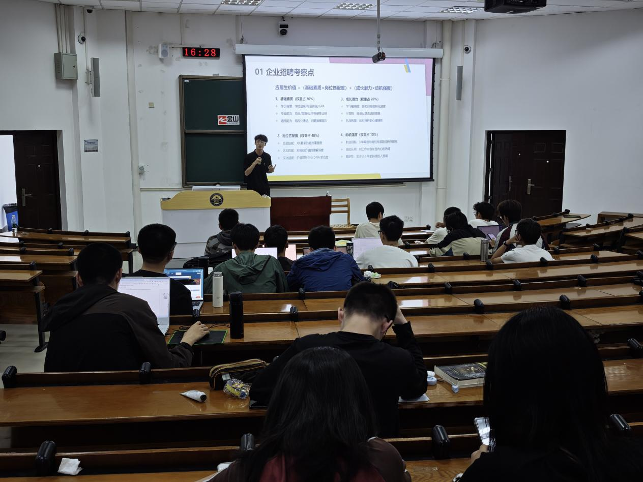15:30,计科楼教室迎来两场干货满满的职业指导。金山集团(武汉)高级经理徐霞以“软件信息行业发展洞察”为主题,解析行业人才需求趋势,分享企业选人用人标准;升学就业研究院研究员钟天围绕“如何制作HR心动的简历”,结合百例实战经验,拆解简历撰写逻辑与优化技巧,引导学生精准匹配岗位需求。