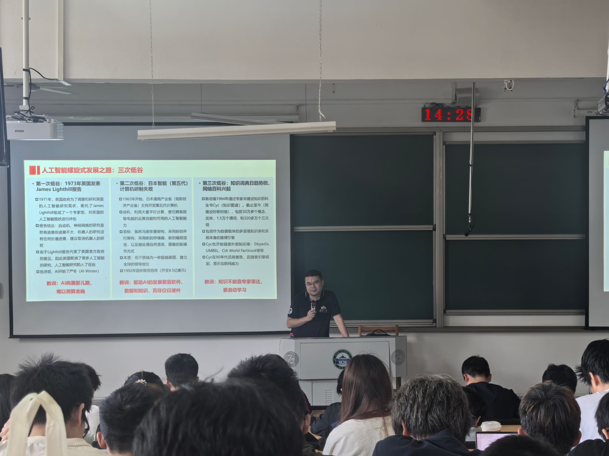 2025年春季学期“图灵读书会”第一期在国软304教室顺利举行,张乐飞教授为2024级本科生带来以“数学之美与人工智能”为主题的分享。本科生工作办公室主任于雅梦、2024级辅导员胡仲淹以及200余名大一同学参加本期读书会。