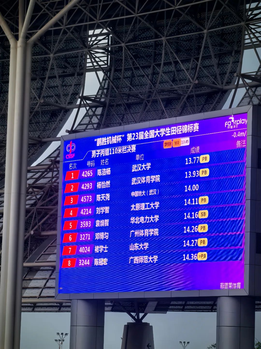 8月12日上午的预赛中,陈浩杨沉着冷静,稳定发挥,以小组第一的优异成绩轻松晋级决赛。当日下午16:40决赛打响,赛场突降大雨。面对湿滑的跑道和严峻的挑战,陈浩杨斗志昂扬,技术精湛,最终以绝对优势率先冲过终点线,展现出了非凡的实力和潜力。赛后各兄弟高校纷纷对武大表示了祝贺,并对陈浩杨赛出的绝佳成绩赞不绝口。